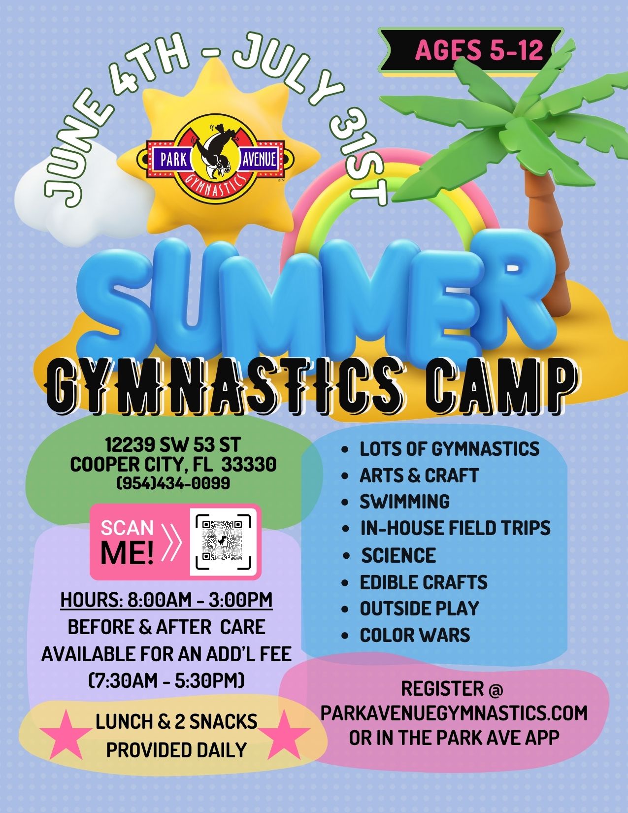 Camp Activities Include: Gymnastics, Swimming, Edible Crafts, Science Experiments, Arts & Crafts, Dress Up Days, Friday Color Wars. All of our field trips are brought in-house, so you don’t need to worry about where your child is.